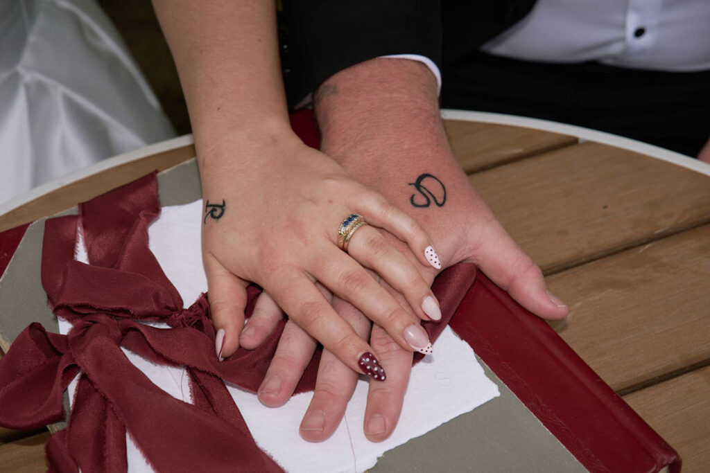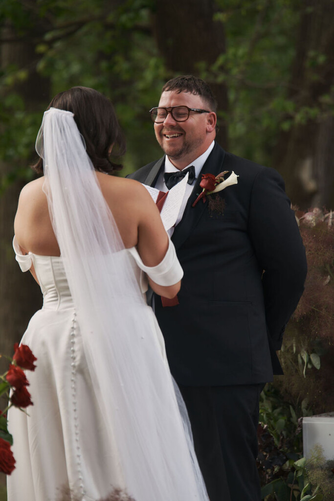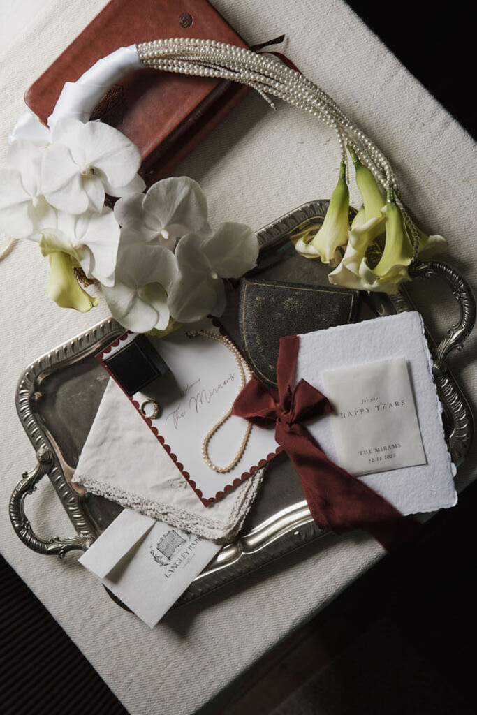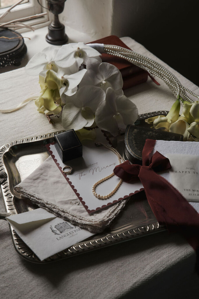 They also chose our vow cards, finished with a flowing silk bow in wine, perfectly complementing their colour palette. Handwritten vows added a deeply personal touch, and these pieces photographed so beautifully amongst their flat lay details and I’m sure will be a treasured keepsake for long to come.
