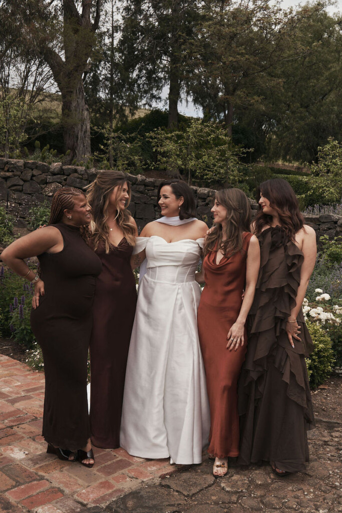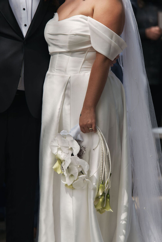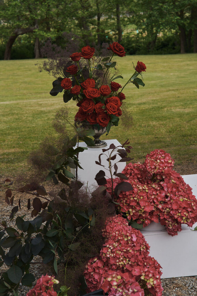 Although Sarah is a florist herself, she chose to step back and fully enjoy the day, entrusting Pixie Thorn Design to bring her vision to life. The result was truly stunning- sculptural, abundant florals in deep tones, with a breathtaking floral nest surrounding an elevated ceremony platform. Her bouquet featured orchids with delicate pearl-beaded touches, adding a beautiful layer of texture and detail.