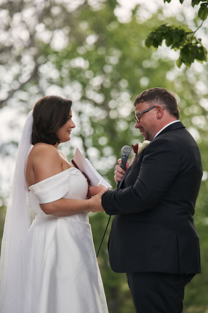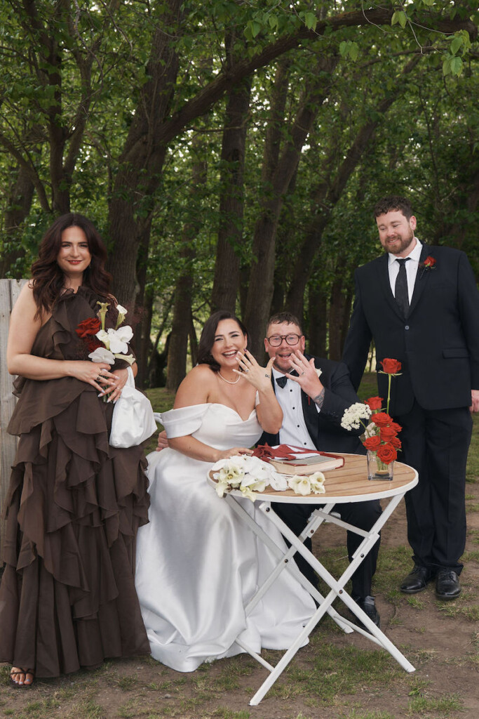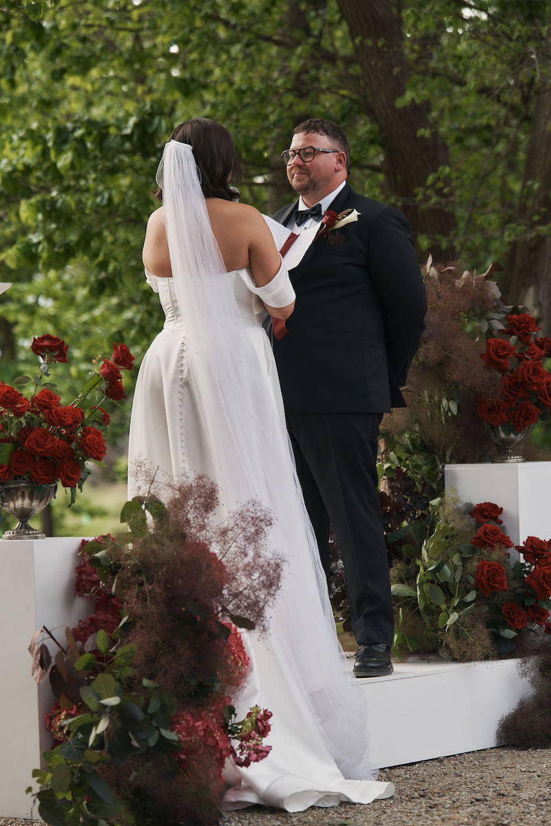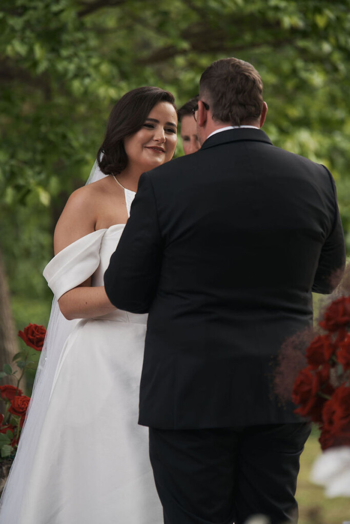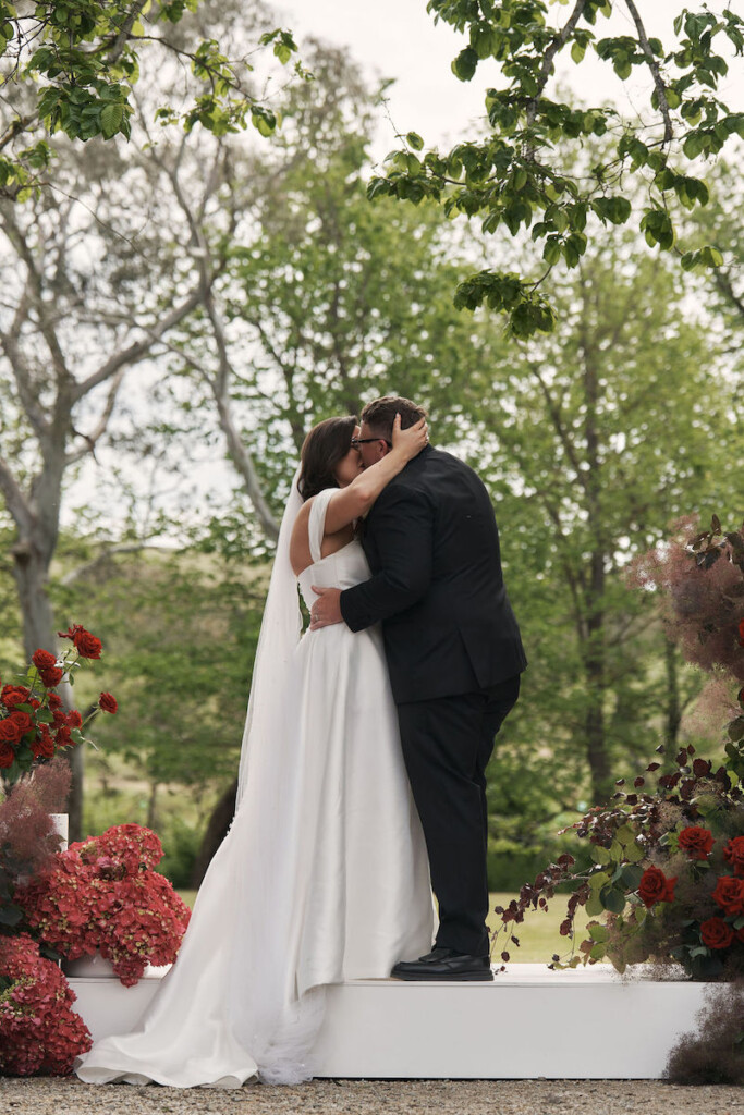 Sarah and Ray were married in the beautiful gardens of Langley Park, Victoria, surrounded by lush greenery and a soft, romantic atmosphere. Their day embraced a rich, modern palette of deep burgundy and red tones – elegant, moody, and effortlessly refined.